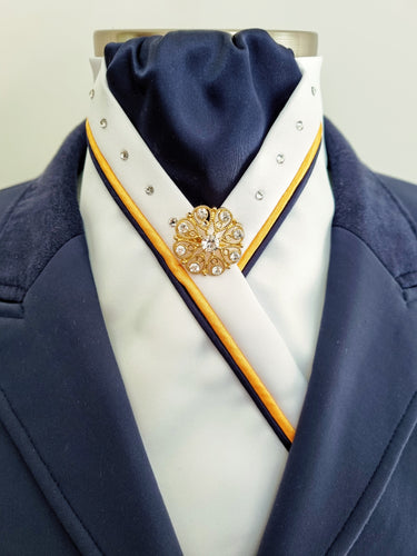 ERA SOPHIE STOCKTIE - White & navy with yellow & navy piping, Swarovski crystals and brooch