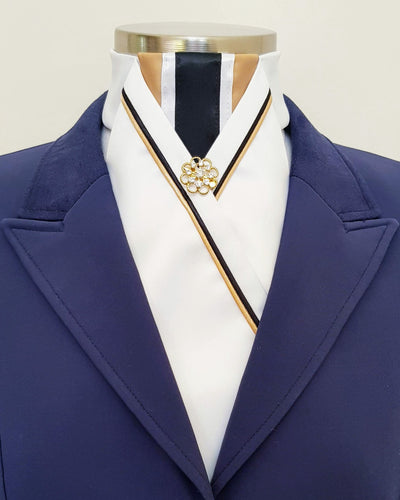 ERA LOTTA STOCK TIE - White satin, gold, white & black striped, gold & black piping and brooch