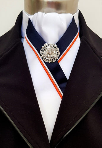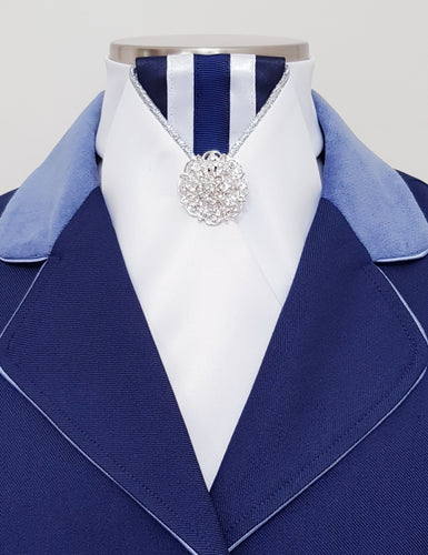ERA LOTTA STOCK TIE - White satin, navy & white striped, silver piping and brooch