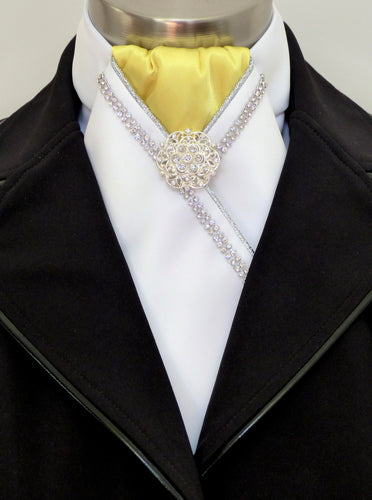 ERA VANESSA STOCK TIE - White satin, yellow, silver piping, crystal trim and brooch