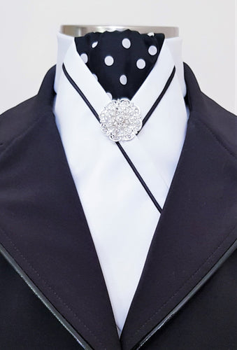 ERA KATE STOCK TIE - White satin, black & white spot, black piping & silver brooch