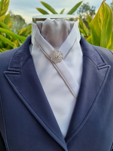 ERA KATE STOCK TIE - White satin, light silver with silver satin piping & brooch
