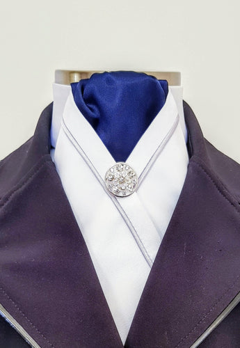 ERA KATE STOCK TIE - White satin, navy blue, silver satin piping and brooch