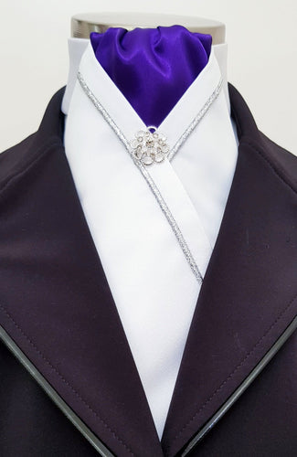 ERA KATE STOCK TIE - White satin, purple, silver piping and brooch