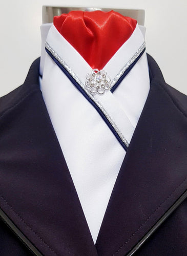 ERA RACHAEL STOCK TIE - White satin, red, silver & navy piping & brooch