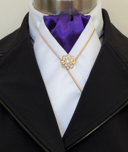 ERA KATE STOCK TIE - White satin, purple, gold satin piping and brooch