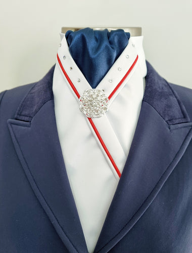 ERA SOPHIE STOCKTIE - White & navy with red & white piping, Swarovski crystals and brooch