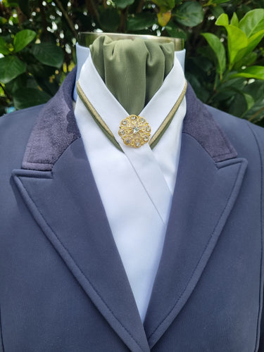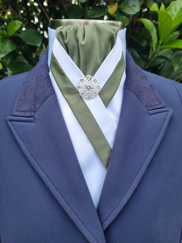 ERA RACHAEL STOCK TIE - White & sage satin with gold and sage "V" piping & silver brooch
