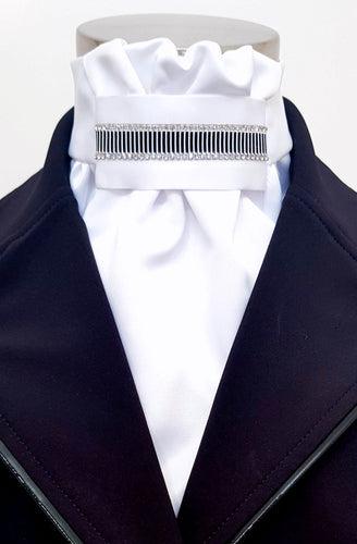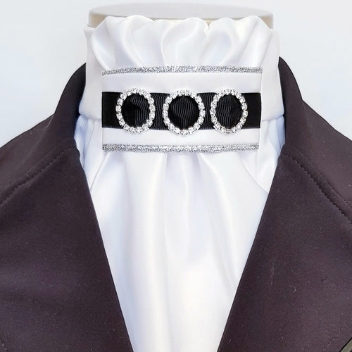 ERA EURO REGAL STOCK TIE - White satin with silver piping, black grosgrain trim and crystal rings