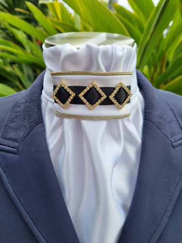 ERA EURO REGAL STOCK TIE - White satin, gold piping, black trim and gold crystal diamonds