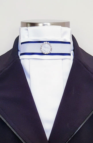 ERA EURO RIVIERA STOCK TIE - White pleated satin, royal blue and white trim and crystal ring