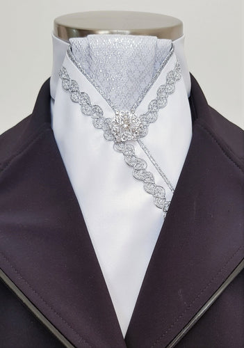ERA ALEX STOCK TIE - White satin, silver pleated brocade, silver piping, silver Wave trim and brooch