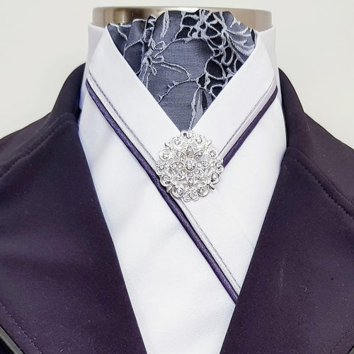 ERA RACHAEL STOCK TIE - White satin, grey brocade, grey & silver satin piping & brooch