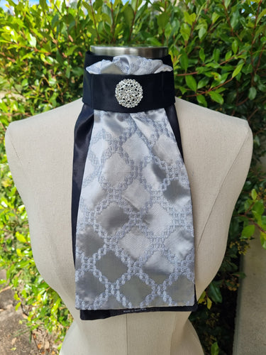 ERA Elle Stock Tie - Soft Ties with silver piping, silver spot brocade & brooch