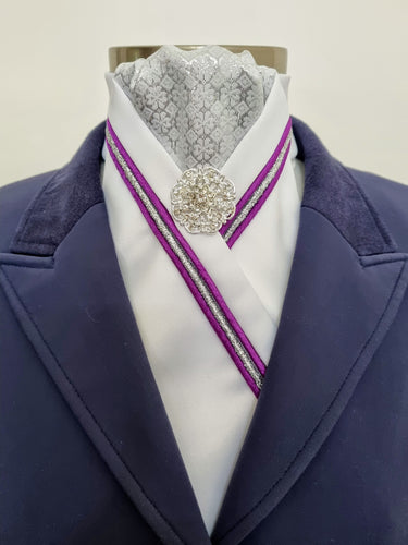 ERA SIENA STOCK TIE - White satin with silver brocade, purple & silver triple piping & brooch