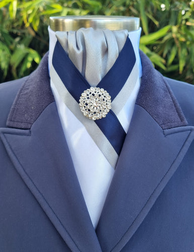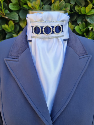 ERA ZARA STOCK TIE - White satin in silver and navy with silver brooch