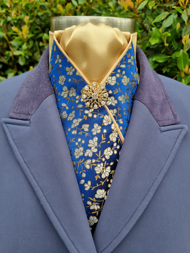 ERA RACHAEL STOCK TIE - White satin, silver diamond brocade, navy & silver piping & brooch