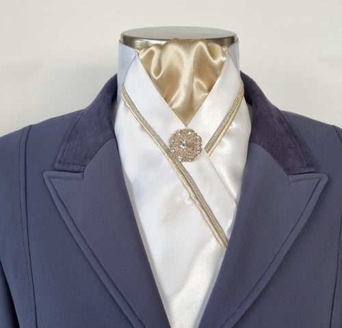 ERA RACHAEL STOCK TIE - White Lustre satin with champagne gold, piping trim & brooch