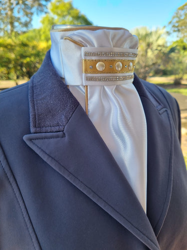 ERA Euro Lyndal Regal Stock Tie - White Satin with gold & crystal trims and pearl cabochons