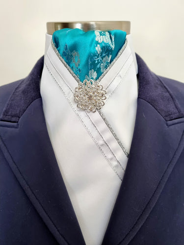 ERA FIONA STOCK TIE - White satin, aqua brocade, silver piping, white trim and brooch