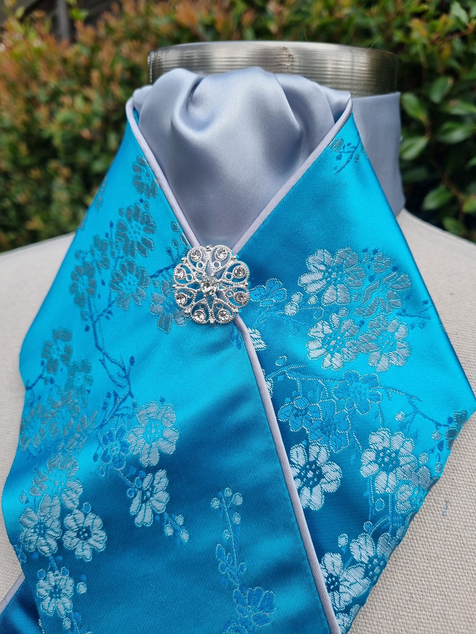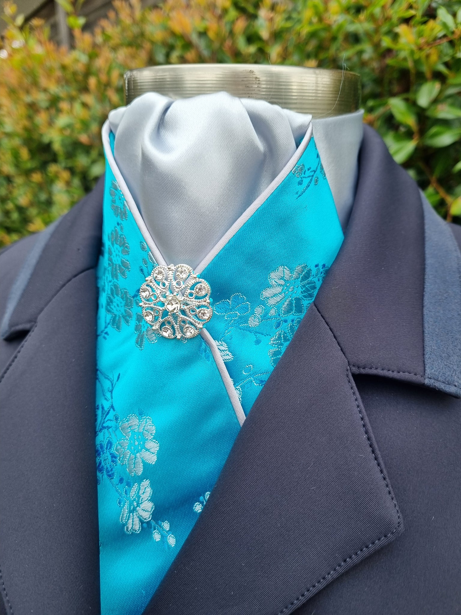 ERA Designer Collection - Pre-tied Stock Tie Plastron Turquoise Oriental Satin with Silver - Imperial