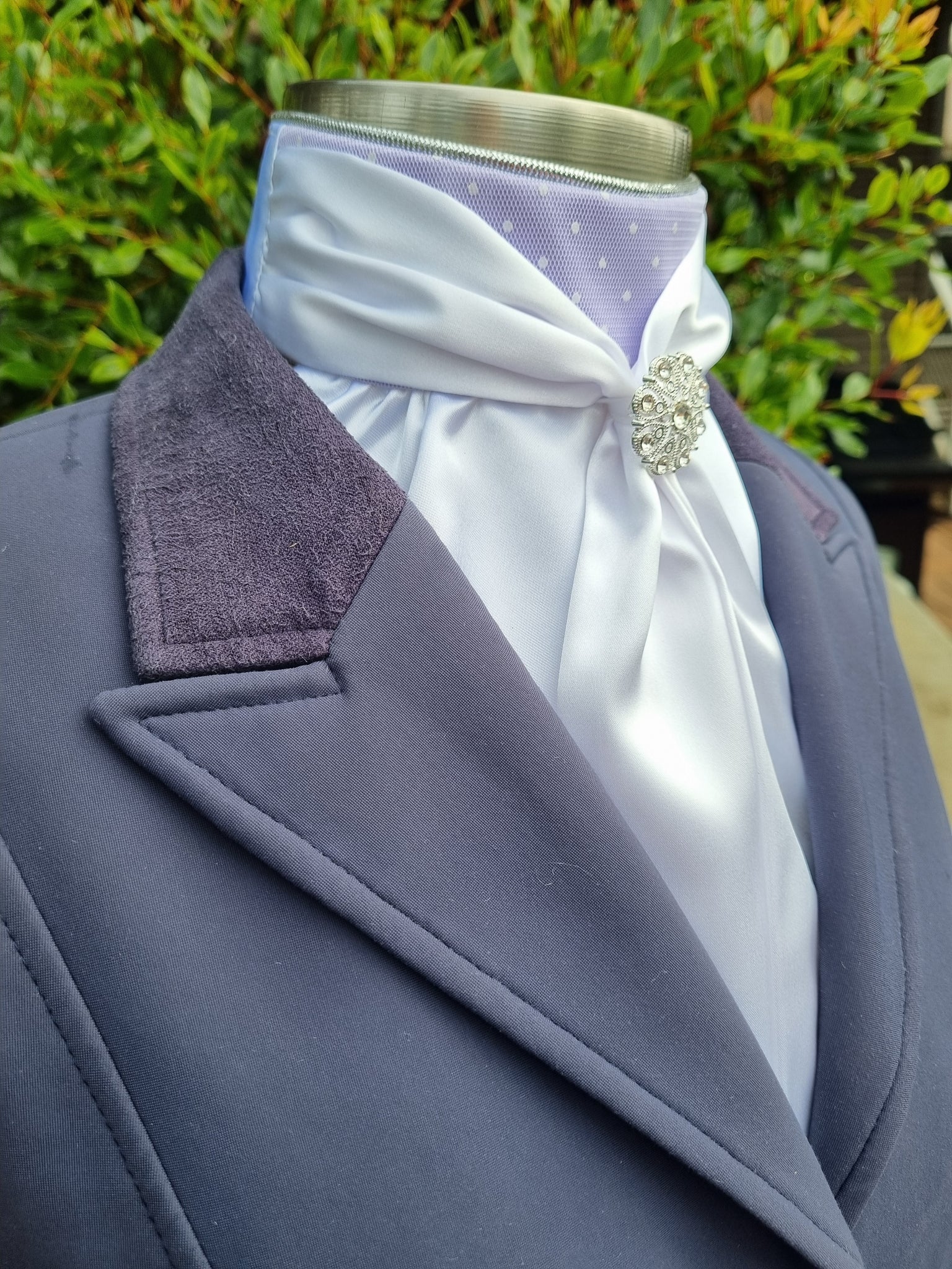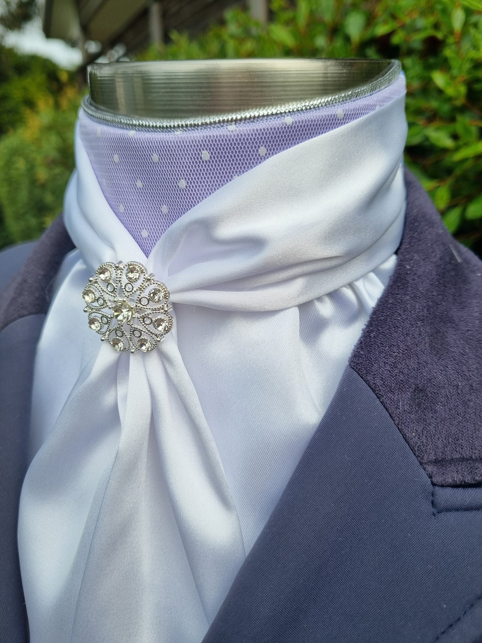 Subtle white spot net over Lilac Satin Centre. Comes with removable brooch included.