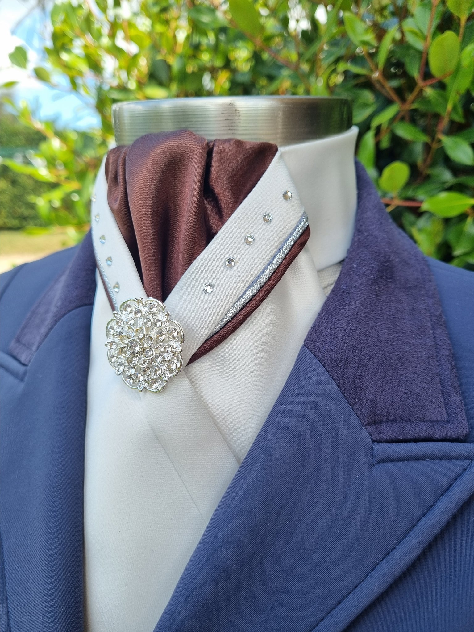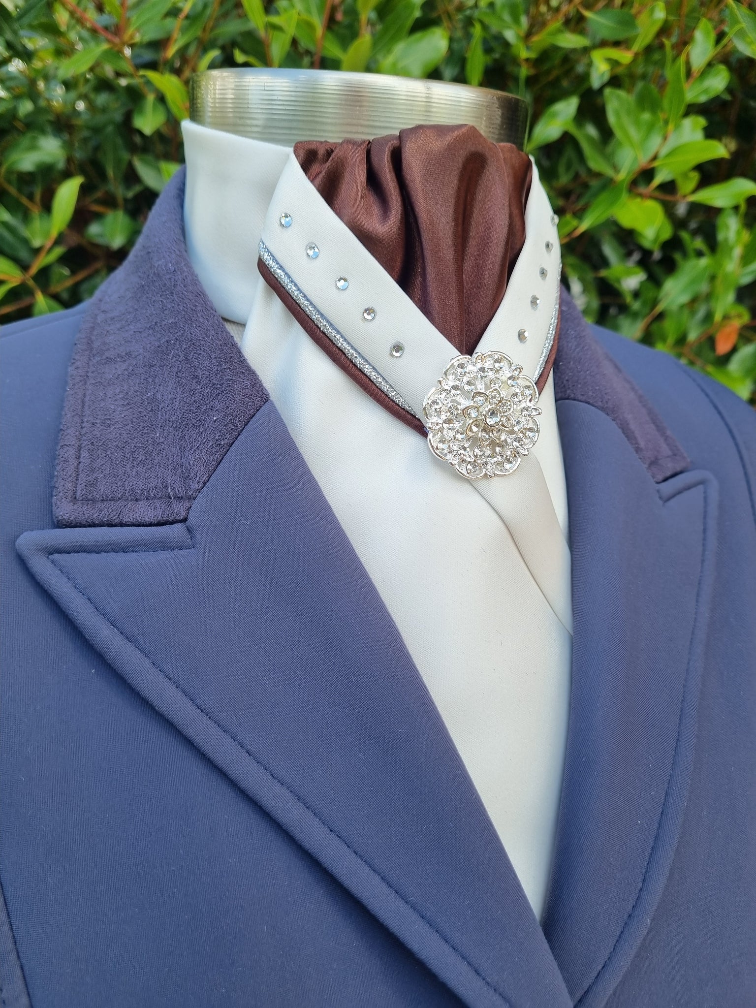 The Sophie Pre-Tied stock tie is made from top quality satin, your choice of Swarovski or Glower crystals and brooch. Secured with a Velcro attachment around the neck.